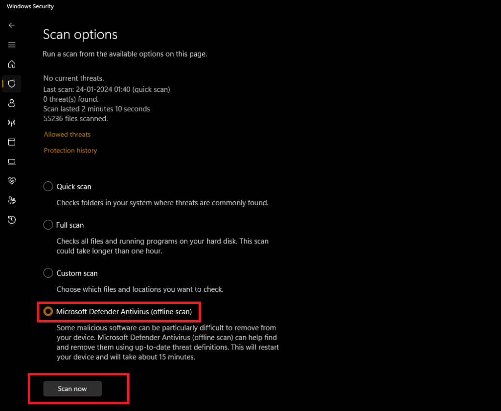 4.SeçmeMicrosoft Defender Antivirus (çevrimdışı tarama)Ve tıklayınŞimdi taradüğme.