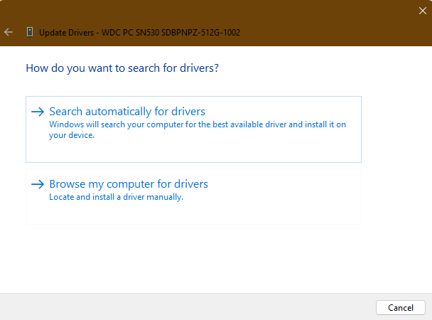 4.SeçinSürücüleri otomatik olarak arayınBilgisayarınızın en son sürümü otomatik olarak yüklemesine izin verme seçeneği. Bilgisayarınızda bir güncelleme dosyanız varsa,Sürücüler için bilgisayarıma göz atınSeçenek ve dosyayı seçin.