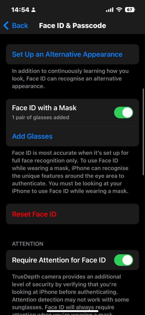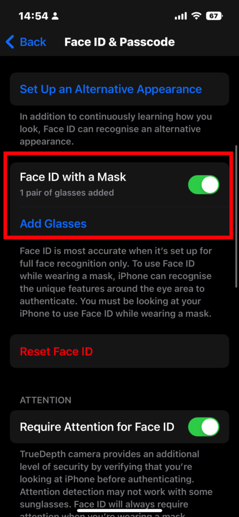 4.Aşağı kaydırınMaskeli Yüz KimliğiSeçenek ve açın.