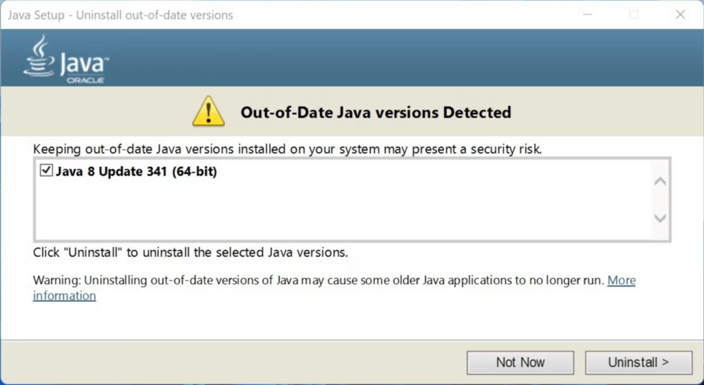 Not:Herhangi bir şans eseri varsa, kurulum işlemi eski bir Java sürümünü algılar, kaldırmak için kaldırmayı tıklayın.