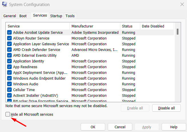 3.TaşınHizmetsekme ve kontrol edinTüm Microsoft Hizmetlerini Gizleonay kutusu.