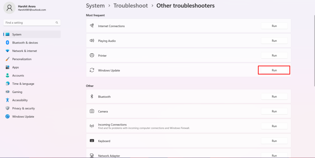 5.Üzerine tıklayınKoşmakYanında düğmeWindows GüncellemesiSorun Giderme Başlatma Sorun Giderme.