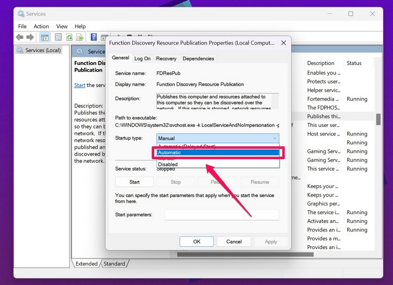 4. Windows 11'de FDRP hizmetini otomatikleştirin