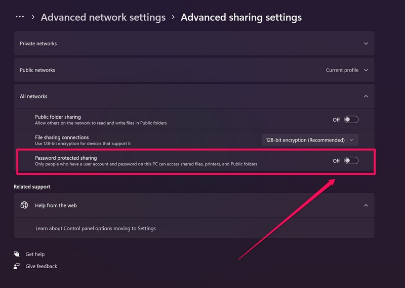 3.Ardından, geçişinParola Korumalı PaylaşımSeçenek kapatıldı. Değilse, devre dışı bırakmak için geçişine tıklayın.