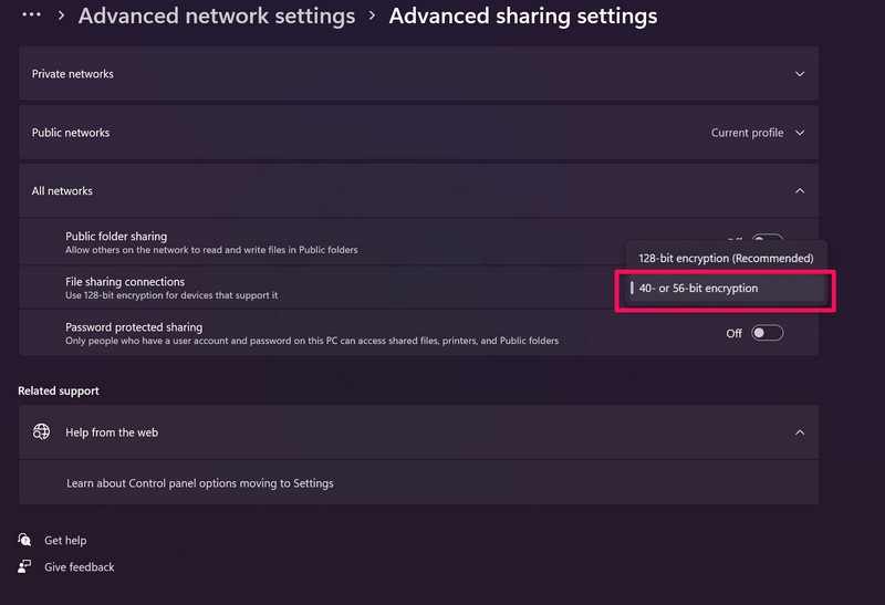 3.Şimdi, için açılır seçeneği tıklayınDosya Paylaşım Bağlantılarıve ayarla40- veya 56 bit encptionayar.