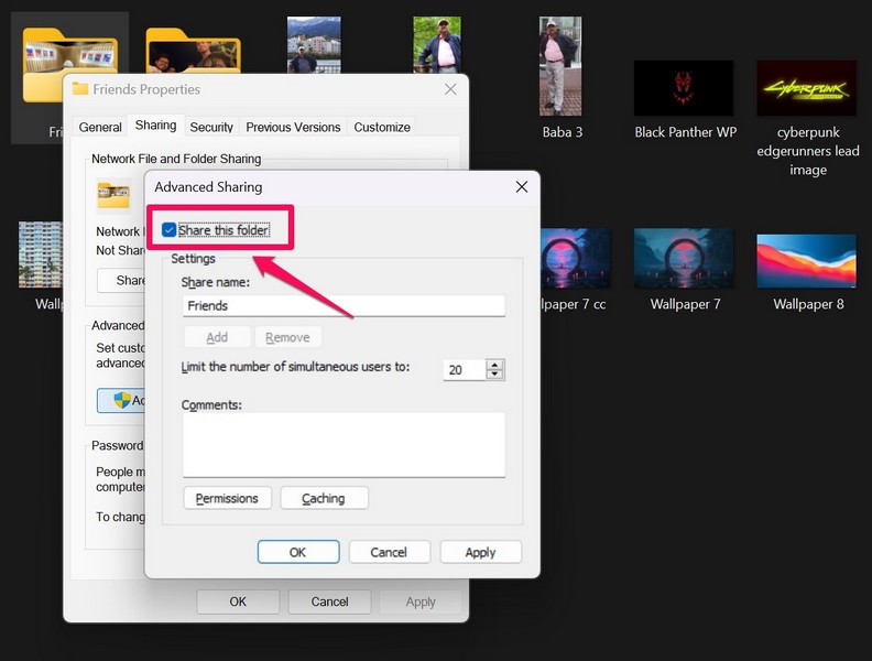 4.Burada, kutuyu kontrol edin.Bu klasörü paylaşetkinleştirme seçeneği.