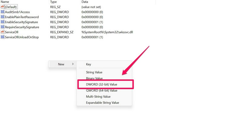 5.AltındaYeniSeçenek, seçinD-kelimesi (32 bit) değerYeni bir anahtar oluşturma seçeneği.