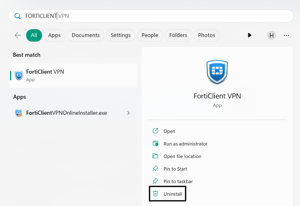 2.İçindeWindows Arama Kutusu, tipForticlientve seçKaldırmakarama sonuçlarından.