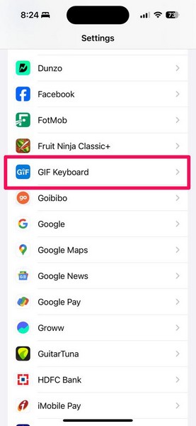 2.Aşağı kaydırınGIF Klavye uygulamasını bulunListede veAçmak için dokunun.