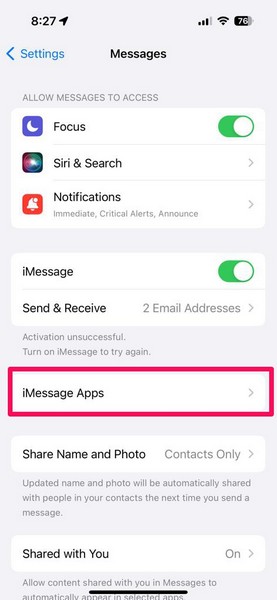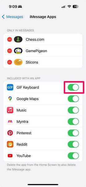 Cihazınızdaki iMessage Uygulama Listesinde bulamıyorsanız, kullanınDüzeltme #2GIF klavye uygulamasının iMessage ayarlarında etkin olduğundan emin olmak için.