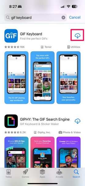 6.Arama sonuçları sayfasında,İndir düğmesi(aşağı oklu bulut) GIF Klavye uygulamasının yanında yeniden yüklemek için.