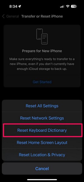 İPhone'unuzdaki çalışma sorunu GIF klavyesini çözmeye çalışabileceğiniz başka bir şey klavye sözlüğünü sıfırlamaktır. Her ne kadar bu hilenin cihazınızdaki GIF klavyesi ile ilgili sorunu çözme şansı olsa da, denemeye değer.
