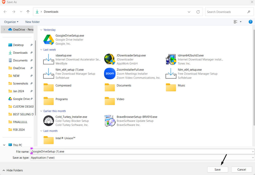 5.İçindeTasarruf etmekistemi, seçKaydetmekGoogle Drive Exe dosyasını indirmek için düğme.