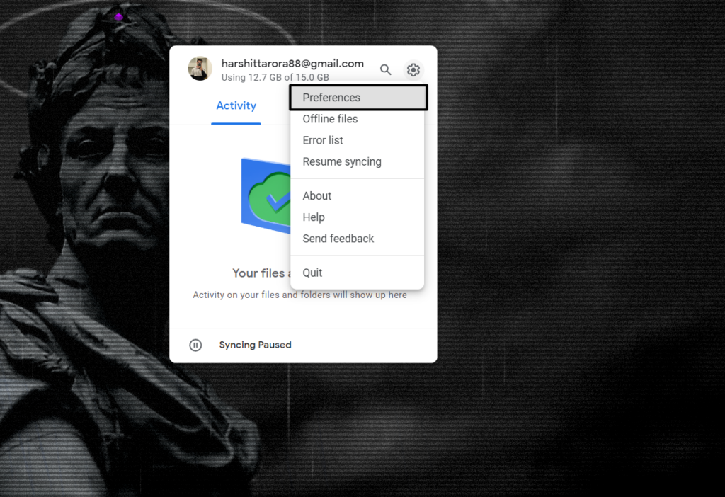 Google Drive'da senkronizasyon seçeneğinin nasıl devre dışı bırakılabileceğini düşünebileceğiniz için bu çözüm göz ardı edilebilir. Bununla birlikte, senkronizasyon işlevini yanlışlıkla duraklatmanız mümkün olabilir, bu yüzden çalışmıyor. Bu durumda size öneriyoruzSenkronizasyon seçeneğinin olup olmadığını kontrol edindevre dışı. Evet ise, açın. Aynı durumdan emin olmak için kesin adımlar aşağıdadır: