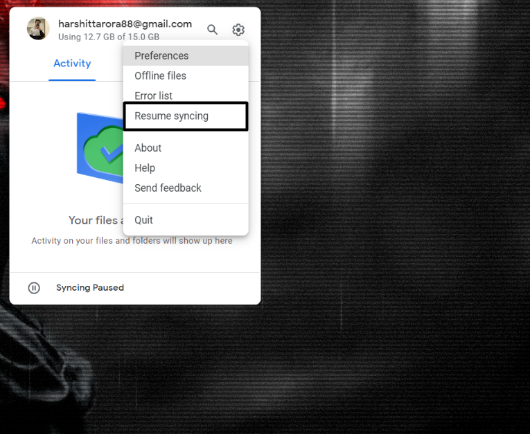 2.Yeni istemde, e -posta adresinizin altındaki kullanılabilir depolamayı kontrol edin. Google Drive'ın depolaması doluysa, otomatik senkronizasyonu tekrar başlatmak için daha fazla depolama almanız gerekir.
