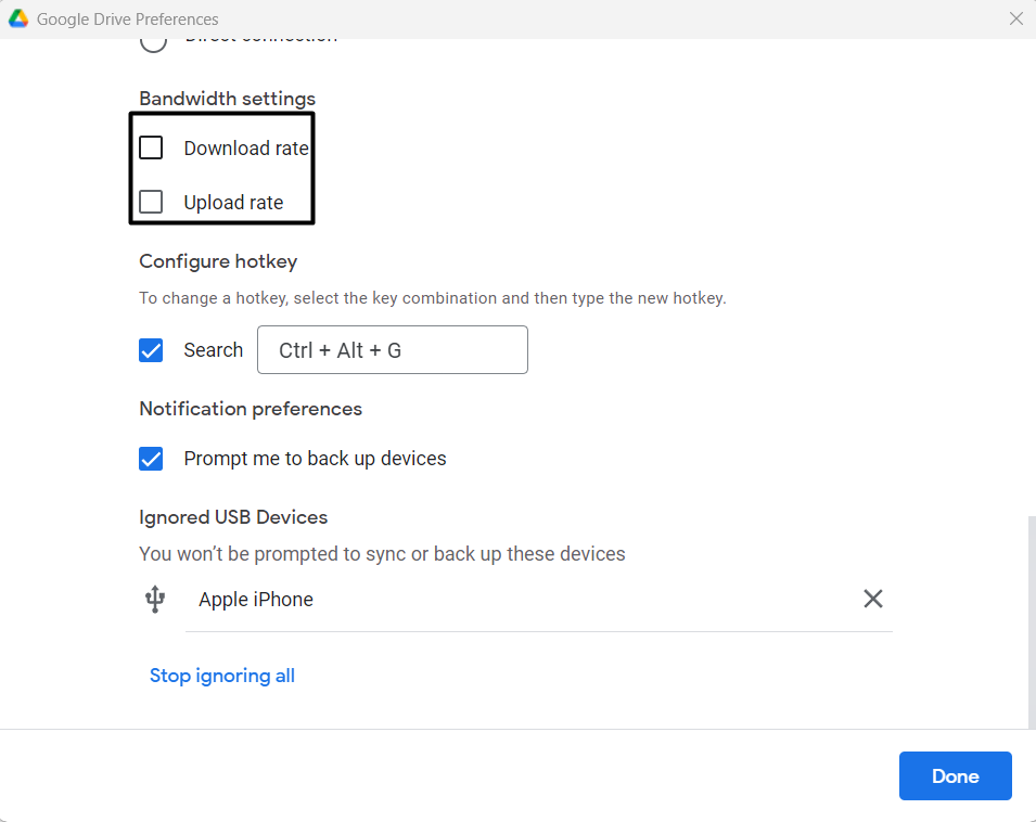 Google Drive, indirme ve yükleme oranını ayarlamamıza izin verir. Bazı bant genişliği sınırlamalarının ayarlanması mümkün olabilir, bu nedenle PC'nin verilerini düzgün bir şekilde senkronize edemez. Bu durumda size öneriyoruzTüm sınırlamaları kaldırınve sorunu çözüp çözmediğini kontrol edin. Google Drive'daki bant genişliği ayarlarının nasıl değiştirileceğini bilmek için listelenen adımları kontrol edebilirsiniz: