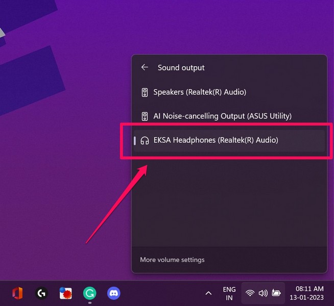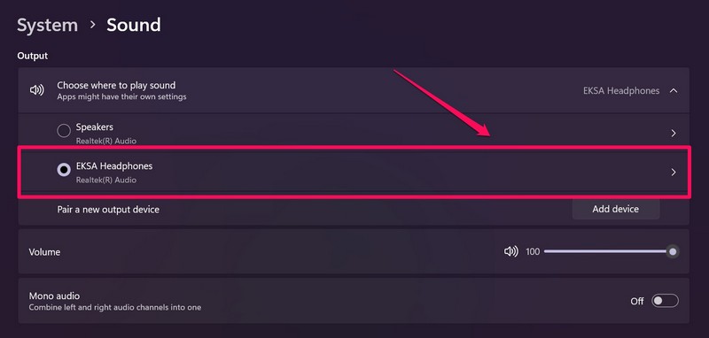 Şimdi, bazen kullanıcıları kulaklıklarının Windows 11'de çalışmadığını düşündüren başka bir yaygın şey, ses için otomatik olarak seçilmedikleri zamandır. Windows 11'e kulaklık veya kulaklık bağladığınızda, sistem bazen varsayılan ses cihazını bağlı kulaklıklara dönüştürmek için “unutur”.