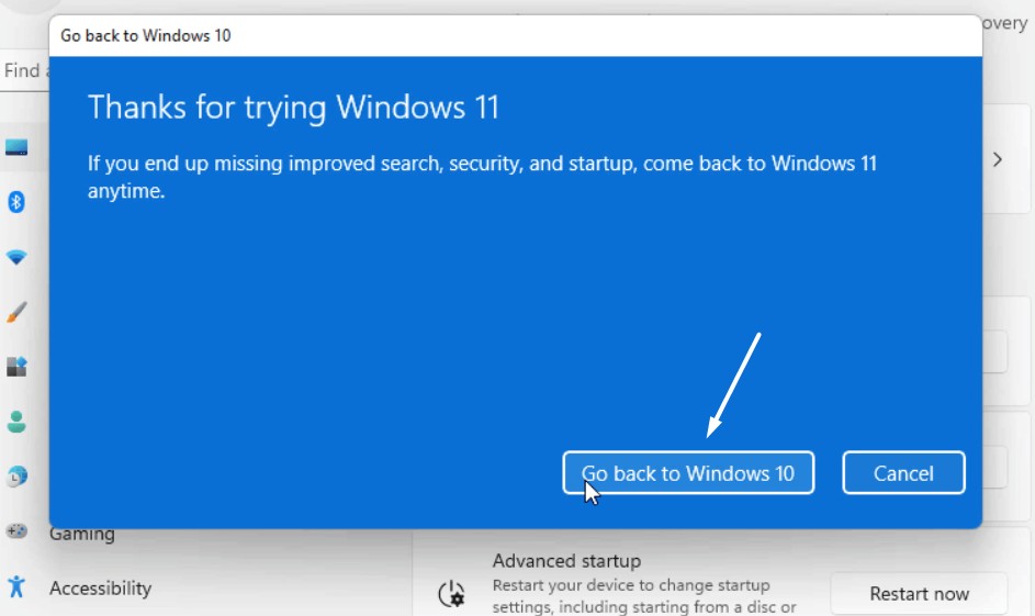 2.İçindeİyileşmekPencere, altındaKurtarma Seçenekleri, seçGeri gitmekYanında DüğmeGeri gitmek.