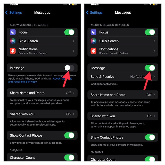 2.Şimdi, iMessage'ın yanındaki geçişi kapatın. Birkaç saniye bekleyin ve tekrar açın.