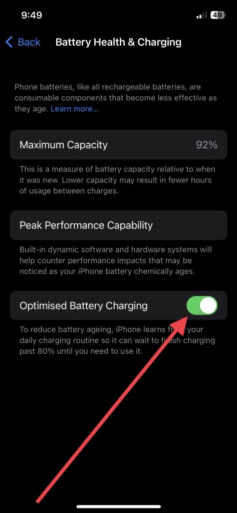 Bu özellik devre dışı bırakıldığında, iPhone'unuz herhangi bir sorun olmadan% 100'e kadar ücret almalıdır. Bununla birlikte, optimize edilmiş pil şarjını kapatmak, pil sağlığının zamanla daha hızlı bir şekilde bozulmasına neden olabilir. Bu nedenle, bu özelliği yalnızca telefonunuzu%100'e çıkarmanız gerekiyorsa devre dışı bırakmanız tavsiye edilir.