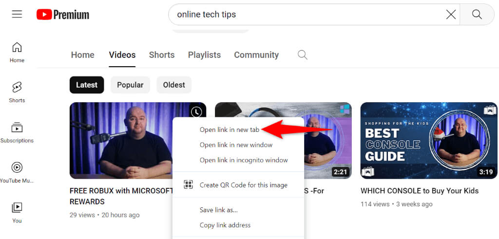 İlk yöntem,CtrlKlavyenizde anahtar veSol tıklamakİstediğiniz videoYeni bir tarayıcı sekmesinde açın. Bu tuş ve tıklama kombinasyonu, tarayıcınıza yeni bir sekmede seçilen bağlantıyı (bu durumda video) açmasını söyler.