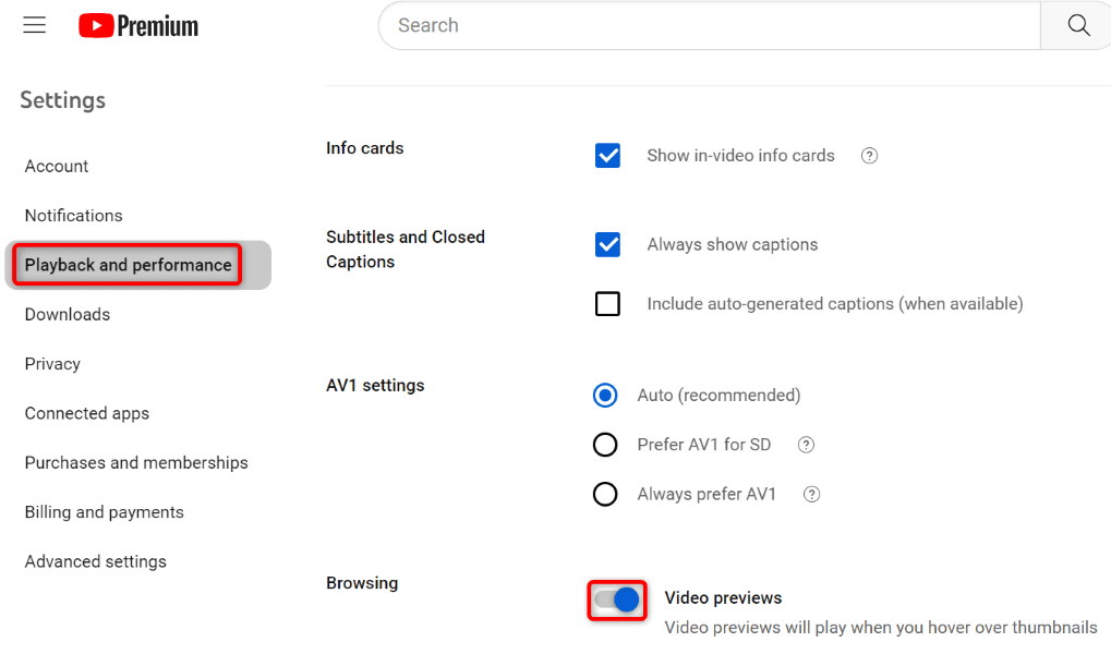 Fark ettiyseniz, YouTube bir videonun üzerine geldiğinizde video önizlemeleri oynar. Bazen bu, sitenin yeni sekmelerde video açmamasına neden olur. Bu durumda, video önizlemelerini kapatın ve sorununuzun çözülüp çözülmediğini görün.