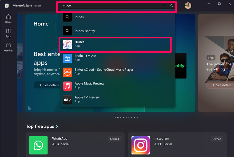 Windows 11 PC'nizde veya dizüstü bilgisayarınızda Microsoft Store uygulamasını açabilir ve iTunes uygulamasını arayabilirsiniz. Göründükten sonra, Windows 11 cihazınıza yüklemek için Yükle düğmesini tıklayabilirsiniz.