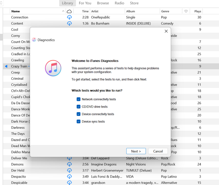 Şimdi, Windows 11 PC veya dizüstü bilgisayarınızdaki iTunes uygulaması açılıyorsa, ancak herhangi bir şarkı, video veya podcast çalmıyorsa, sorunu çözmek için uygulamanın kendisindeki iTunes Diagnostics özelliğini deneyebilirsiniz. İTunes Diagnostics, iTunes içinde, sistem yapılandırmanızdaki uygulamanın arızalanmasına neden olabilecek sorunları tespit etmek için bir dizi test çalıştıran yerleşik bir araçtır.