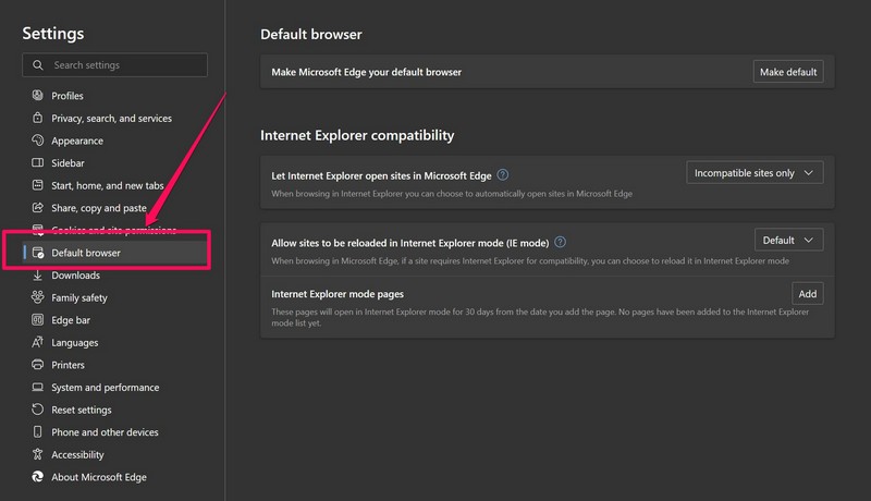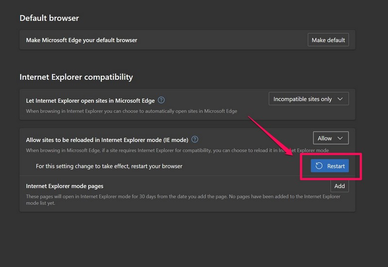 3.AltındaVarsayılan tarayıcısekme, tıklayınEklemekiçin düğmeInternet Explorer modu sayfalarıseçenek.