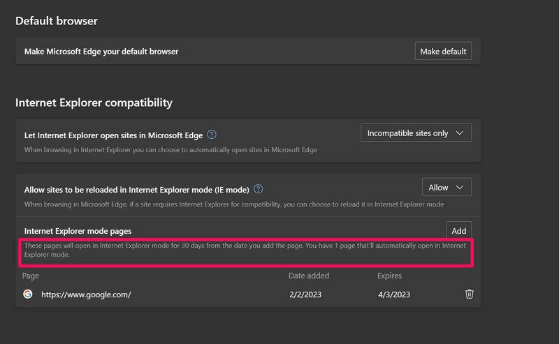 Not:Microsoft Edge'deki IE modu listesine eklediğiniz sayfalar30 gün sonra otomatik olarak sona ererEkleme tarihinden itibaren. Bu nedenle, sayfaların süresi dolduktan sonra, bunları tekrar Edge'deki IE modu listesine eklemeniz gerekecektir.
