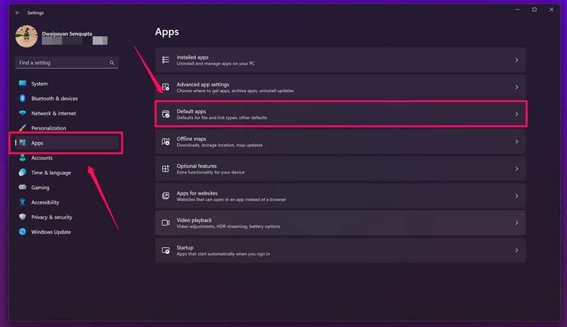 2.AltındaUygulamalarSekme Sol Nav çubuğunda,Varsayılan uygulamalarseçenek.