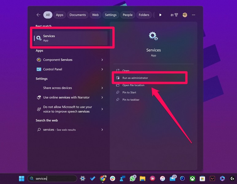 2.TıklayınYönetici olarak çalıştıriçin düğmeHizmetler UygulamasıArama sonuçlarında.