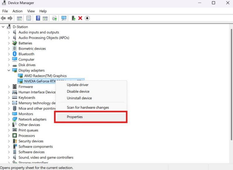 2. Grafik sürücünüze sağ tıklayınve seçÖzellikler seçeneğiBağlam menüsünde.