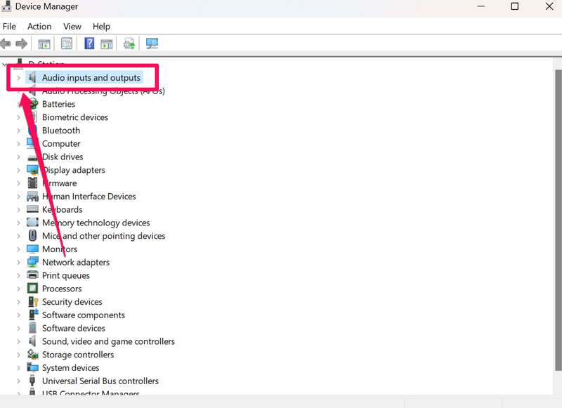 1.Ses giriş cihazını yeniden yüklemek için çalıştırınCihaz yöneticisive genişletSes girişleri ve çıkışları.