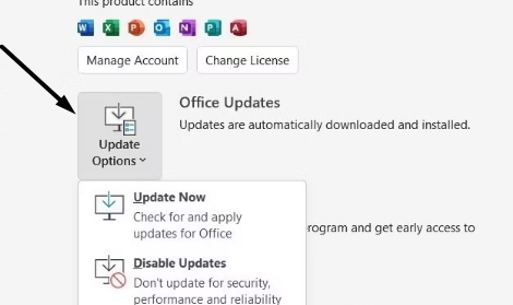 3.SeçinŞimdi GüncelleSeçenekGüncelleme SeçenekleriYeni Excel güncellemelerini taramak için açılır menü.