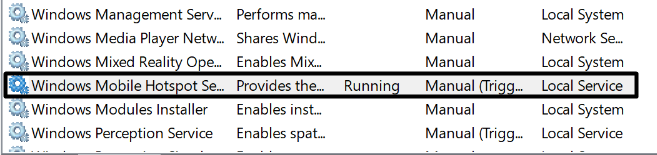 Windows Mobile Hotspot hizmetinin düzgün çalışmaması mümkündür, bu yüzden bu sorun ortaya çıkıyor. Bu durumda size öneriyoruzWindows Mobile Hotspot hizmetini eski haline getiriniçindeHizmetler Yardımcı Programıİyi çalıştığından ve bu soruna neden olmadığından emin olmak için. İşte bu hizmeti kolaylıkla yeniden başlatma adımları: