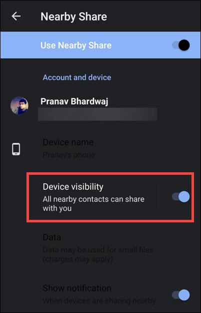 3.“Cihaz Görünürlüğü” seçeneğini arayın ve yanındaki düğmenin açık olduğundan emin olun. Değilse, etkinleştirmek için geçişe dokunun.