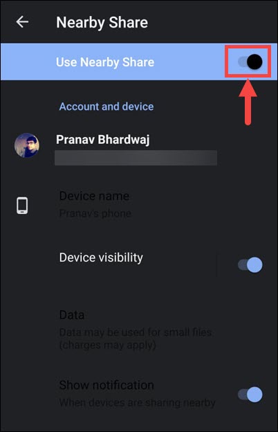 4. Her iki cihazdaki yakındaki paylaşımı etkinleştirin