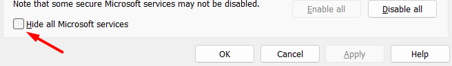 3.GitHizmet vermeksekme ve kontrol edinTüm Microsoft Hizmetlerini Gizleonay kutusu.