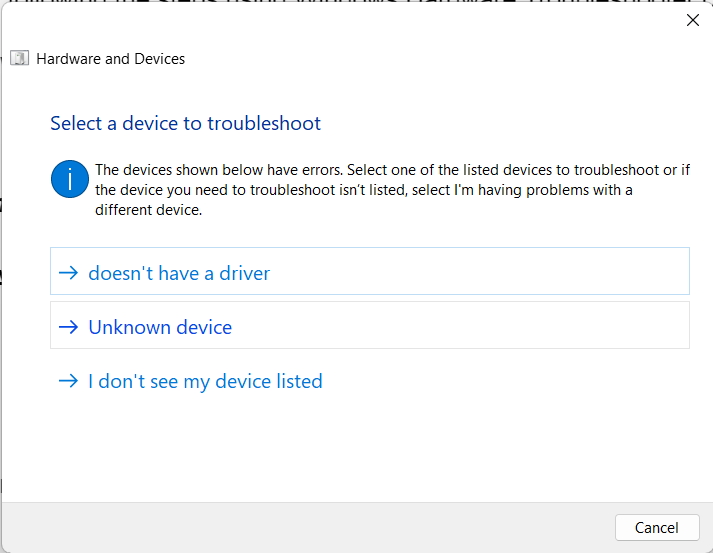 4.AçıkSorun gidermek için bir cihaz seçinPencere, seçinBilinmeyen cihaz.