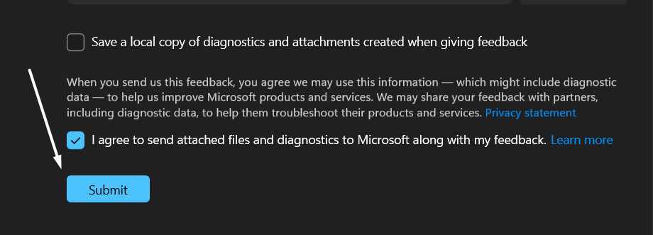9.SeçinÖnemli işlevsellik çalışmıyorradyo düğmesi ve ardındanGeri bildirim verirken oluşturulan ekli dosya ve teşhis ve ekler göndermeyi kabul ediyorumonay kutusu.