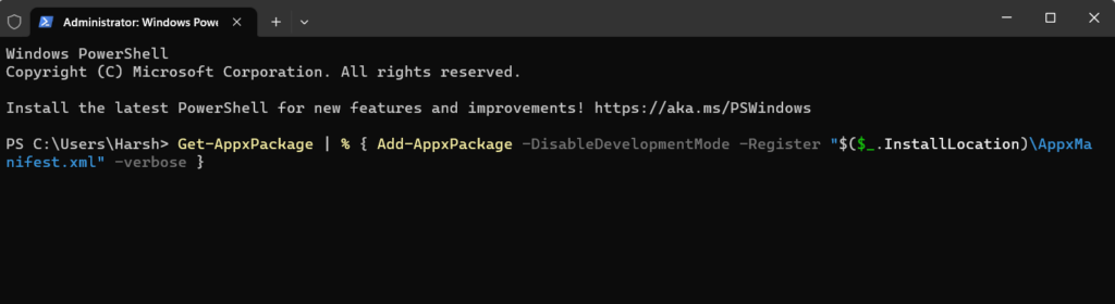 Get-AppxPackage | % { Add-AppxPackage -DisableDevelopmentMode -Register "$($_.InstallLocation)AppxManifest.xml" -verbose }