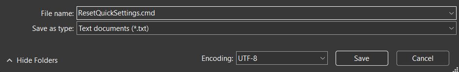 3.SeçmeTasarruf etmekmenüden ve belgeyi adlandırınResetquicksettings.cmdve tıklayınKaydetmek.