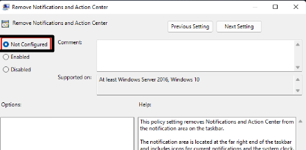 3.Çift tıklayınBildirimleri ve Eylem Merkezini Kaldırve seçYapılandırılmamışRadyo düğmesi.
