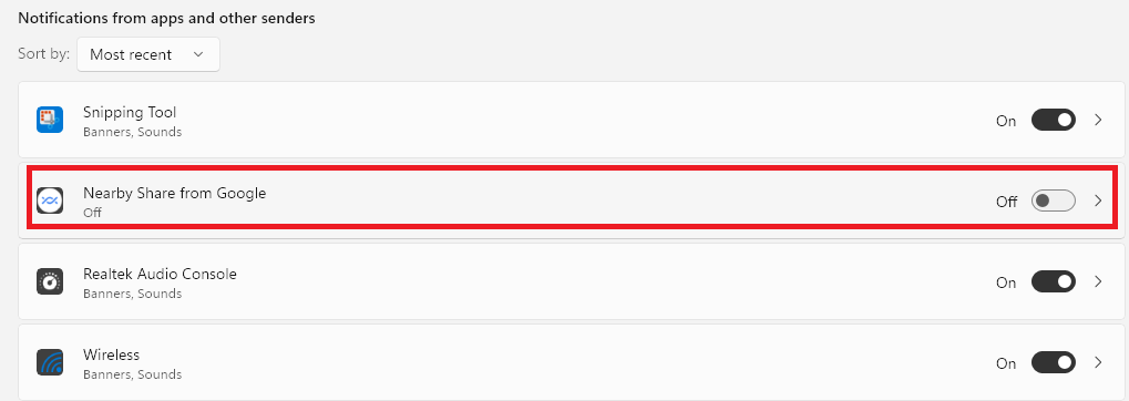 Yani, Hızlı Paylaşım uygulamasından bildirimleri kapattıysanız, kullanırken sorunlarla karşılaşabilirsiniz. Windows 11'deki Google uygulamasından hızlı paylaşım için bildirimleri etkinleştirmek için bu adımları izleyin: