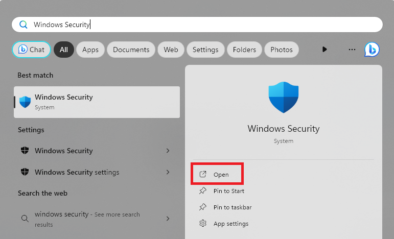1.Başlat menüsünü açın. TipWindows Güvenliğive tıklayınAçıkseçenek.