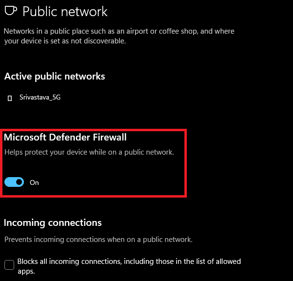 4.Geçişi kapatınMicrosft Defender Güvenlik Duvarı.