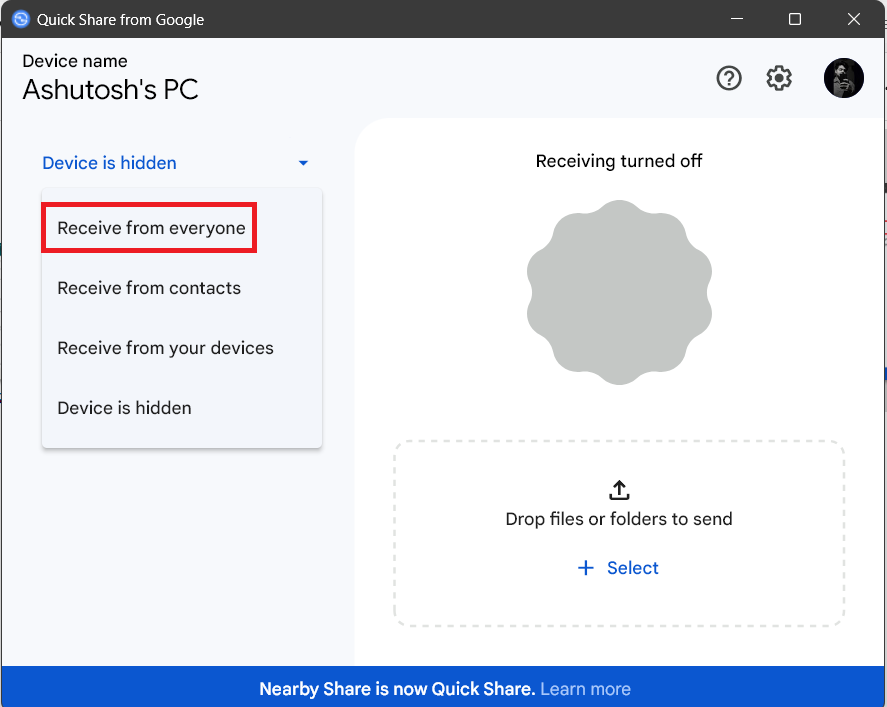 Google Hızlı Paylaş PC uygulamasındaki yanlış görünürlük ayarları, bağlantı sürecinde de çatışmalara neden olabilir. Örneğin, PC'nize bir dosya gönderirken, görünürlük ayarıGizlenmiş, aramada görünmeyecek.