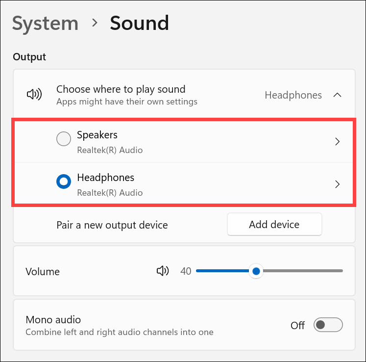 2.Çıktı başlığı altında tıklayınNerede Ses Oynayacağınızı Seçin.