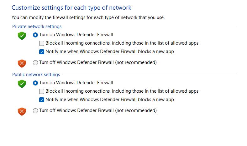 Şimdi, hem genel ağ ayarları hem de özel ağ ayarları için “Windows Defender Güvenlik Duvarı” seçeneklerine dokunun.